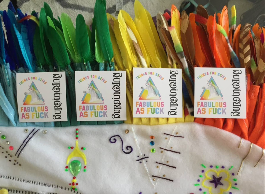 I always carry my stickers on my person, even in everyday life. It’s a rainbow Unicorn with rainbow letters that say “Thanks for being fabulous as fuck”. I got it from a greeting card I saw and instantly connected with. These stickers have the ability to light up people’s faces. No Bullshit.